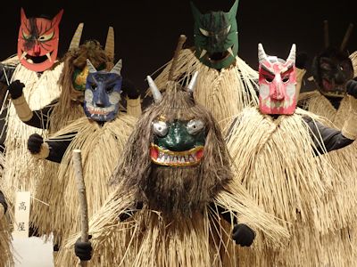 この記念館では、藁をまとった等身大の人形たちが秋田各地のなまはげ面をつけて立ち並ぶ部屋があり、その迫力に圧倒される。