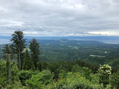 山頂手前にある社殿からは東側の景観が開けている。函館山の景色と同様、男鹿半島のくびれて細くなっている付け根部が見渡せる。右と左から海がせり出している。