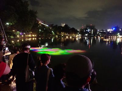 夜の池がライトアップされ、水上ステージ、蓮の水面プロジェクションマッピング、タップダンサーなどの出し物があり、公園歩道には調理車が連なり、オムライスやハンバーガーなどの食事を提供している。