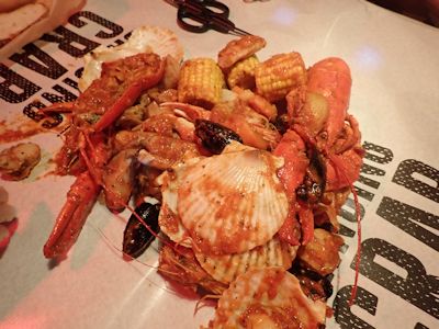 すなわち、テーブルには紙のシートが敷かれ、その上にカニ、エビ、その他魚介、野菜を味付けしたものがぶちまけられ、それを手袋をつけて手で食べていく。