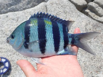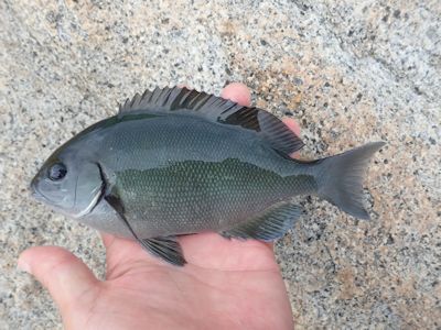 8:10〜16:30まで釣って、イスズミ1(29cm)、メジナ2(手のひら、コッパ)、オヤビッチャ1、アメウオのような魚1、カサゴ1。
