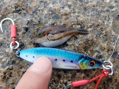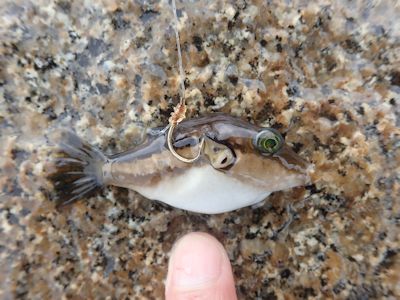 ジグを磯際に落としたら、やっぱり小キタマクラがかかってくる。