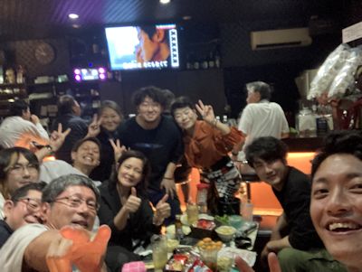 最後ということで大いに盛り上がる。Hさんが予約してくれていたおかげで、いつものソファ席に座れた。いつも一人で来ている常連のおじさんたちも、カウンター席に陣取っている。