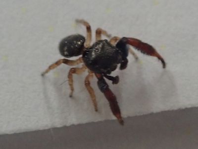 後で調べると、どうやらウデブトハエトリグモらしい。