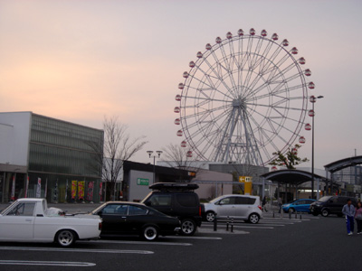 再び車を走らせる。金曜の夜、もっとも疲れている時間帯だが、なぜかそれほど眠くはない。目を血走らせて運転を続け、ついに夜が明ける。6時過ぎ、目的地・豊明ICの直前の刈谷サービスエリアで休憩。朝のすっきりしない曇天の中、近くに巨大な観覧車が静止している。