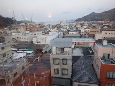 八幡浜の街並み。港に造船所らしきクレーンが見える