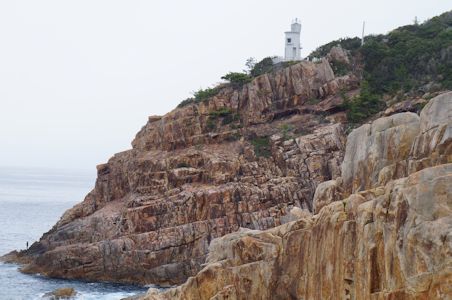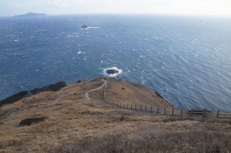 臼碆灯台 左下の断崖下に一人の釣り人 (高知県土佐清水市)