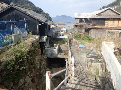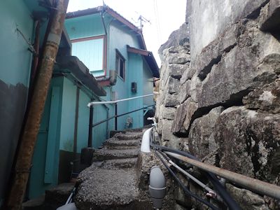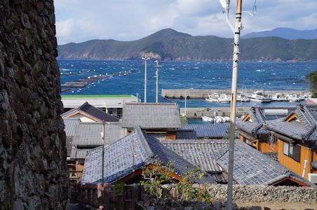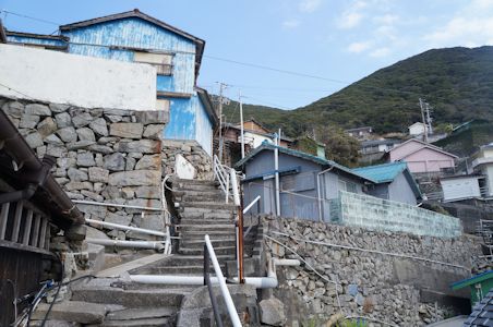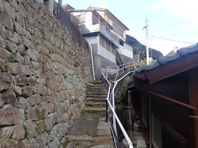 弘瀬の街も石垣と石段。色のついた建物多い(高知県宿毛市沖の島)