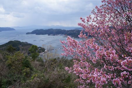 紫電改展示館の外には、御荘湾と桜が共演している(愛媛県愛南町)