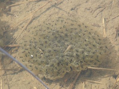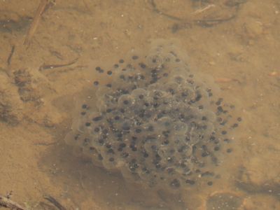 塊状の卵塊なので、アカガエルの卵だ。ヒキガエルの卵塊は、ひも状である。