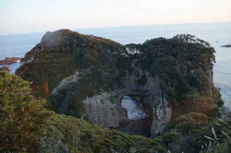 白山洞門をジョン万次郎足湯から見下ろす。巨大な岩塊に穴が開いている