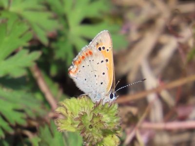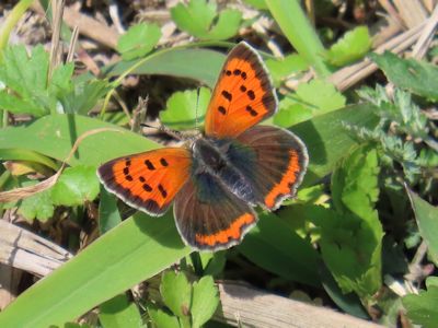 ベニシジミが地面の草に降りている。愛らしい。