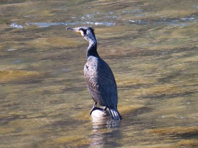 カワウは広々とした川の上に突き出した小さな石の上に立ち、辺りを見回している。