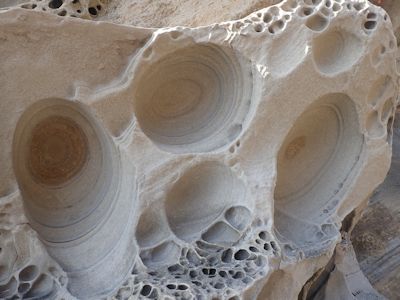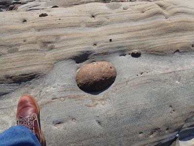 砂岩にがっちりと埋め込まれた丸い茶色の岩。コンクリーションと言い、