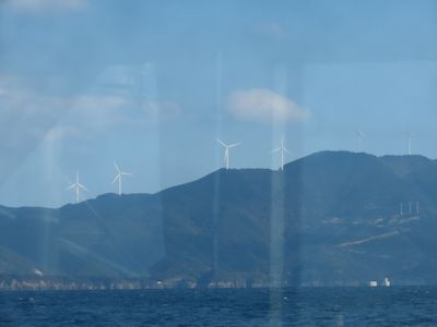 沖の島行きのフェリーから見る大洞山の風車群