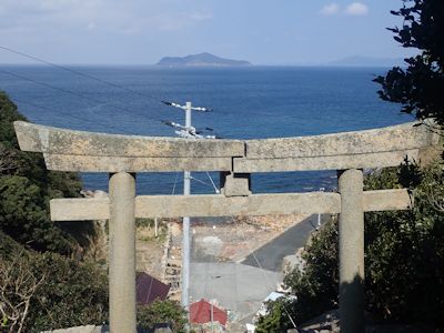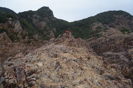 柱状節理的な岩塊の上に立つ竜宮神社 (高知県土佐清水市)