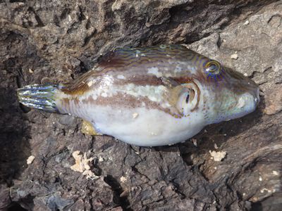 浮き桟橋の縁にハコフグ系の魚がいる。色とりどりの海藻。