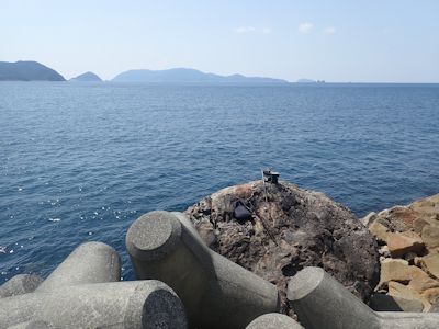 テトラ横の岩の上に釣り座を構える(高知県大月町)