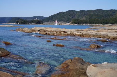 竜串海岸。対岸に見えるのは足摺海底館 (高知県土佐清水市)
