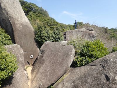 山の中腹に廃された唐人石。岩の上の人の大きさから、岩の大きさを