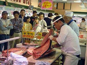 実家のすぐ近くのスーパーのチラシでもマグロの特売にあわせ、「鹿児島奄美大島産本マグロ解体実演販売開催!」と宣伝していたので今日見に行った(笑)。この「マグロ解体ショウ」というのは今流行の人気回転すし屋でもやっている、一般庶民に対する一種の客寄せパンダになっているようである。寿司屋であればさばきたてホヤホヤのトロが食えるし、スーパーであればすぐにパック詰めして売り出すのだ。価格表示を見ると1パック大トロ1800円、中トロ1200円、赤身800円、と威勢のいい数字がズラリと並んでいるが、カートを押しながら長蛇の列を作ったオバちゃんオジちゃんたちはこれまた威勢よく切り立てマグロを買っていく。このごくフツウのオッちゃんオバちゃんジイちゃんバアちゃんの旺盛な購買意欲を見ていると、今まで長らく日本を覆い尽くしていた(と思われる)不景気感が嘘のように、現代日本のマグロマグロ現象が身近に感じられるのだ。売り出す方というかブームの火付け役はあの手この手の手練手管であろうからいろいろなことを考える。その手に乗った流行大好きの日本人。こういうものには反射的にすぐに飛びつくのが現代日本人の習性である。今やネコも杓子もすし屋もスーパーもマグロマグロなのだ。