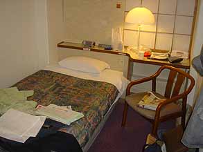 東京は大井町駅前にそびえる阪急系ビジネスホテル。16階建て、各階30部屋くらいある巨大ビジネスホテルで、部屋は通常通り狭いが、建物は新しく、清潔感がある。そして都心ど真ん中の絶好のロケーション。その割に料金が異様に安い。1泊5500円である。そのため、日本全国から東京に出張してきたと見られるビジネスマンの姿で、広々としたフロントは常に賑わっている。僕は東京で住む部屋を探すためこのホテルに4泊した。