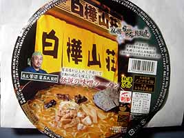 近頃のカップ麺はこの形態が多い。「各地にある名物ラーメン屋の味を再現」を売り物にしたやつ。テレビのラーメン番組でも、各地の有名ラーメン店の店主がタレント的に扱われる番組が増えてきている。カップラーメン業界もテレビ業界もあの手この手でラーメンの新しい流れを作ろうとしている。 |