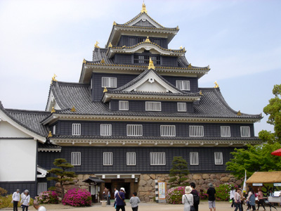 岡山城、黒いから別名烏城。鮮やかな外観だ。黒塗り、黒瓦と格子窓の白枠がコントラストを描く。そして、形も非常に均整が取れている。こういうのを美しいっていうんだろう。城の周りには屋台や茶屋が出て、休日の観光ムードを盛り上げている。