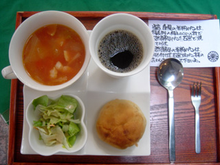 泊まったビジネスホテルは朝食付き。ここの朝食は、ただのパンにコーヒーというビジネスホテル特有の、原価ほぼゼロの味気ないものではなく、もっちりとして中身が詰まった特製米粉パンは、岡山いこいの村で天然酵母パンを石釜で焼いたもの。そしてミネストローネスープにサラダ、コーヒー。いい。