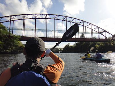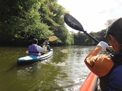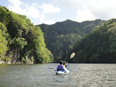 2艘のカヌーに二人ずつ乗船し、亀山湖を進む。カヌーの醍醐味は、水の上を風を切って移動する爽快感と、普通の人が見れない光景を見れる感動である。