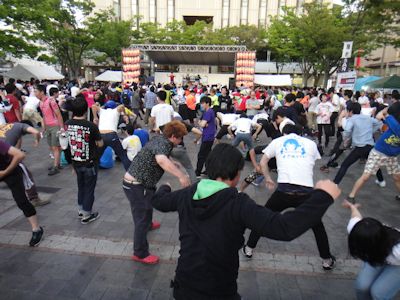 若者たちは、なんか一筆書かれたTシャツを着ている。オリジナルTシャツなのか、自分たちが所属するグループだかサークルの名前なのか、みんなグループごとに様々のTシャツを着ている。そういう若者たちが、アップテンポのアニメ音楽に合わせ、足を広げて立ち、手を振り回し、上半身を左右に振り、ひねり、頭をバンギングさせ、踊りまくっているのだ。その踊りが独特で、なにか霊が憑依した人というか、憑りつかれた感じの人のように、普通の人の動きではない。きっと、曲ごとに振付が決まっているのだろうが、多くの若者たちがアニメ音楽に合わせて一心不乱に激しい憑依踊りをしている光景は圧巻である。怪しげな宗教団体の集会の感がある。