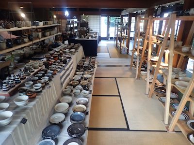 旧吉松家住宅に入る。住宅内だけでなく、外のスペースにも、所狭しと多数窯元の陶磁器が並んでいる。