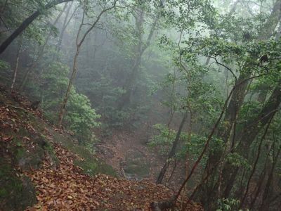 帰り道は少し迷いそうになるも40分ほどで降りる。霧が出てもやっていた。