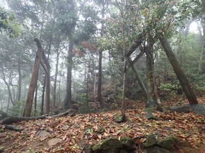 山頂(標高479m)まで1時間弱。雨の中、ズルズル滑る登山道を上がる。途中倒木などあるも、擬木階段も出てきて、それほどきつくはなかった。足下が悪いのだけが問題。