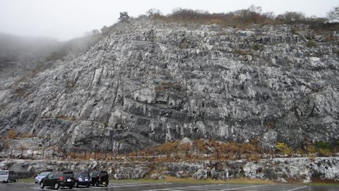 駐車場の脇は、ギザギザの岩肌がむき出しになった山で、その荒々しさは晩秋冷雨の寂寥にふさわしい景観だ。「切羽」という独特の岩状らしい。その高さは140mとのこと。