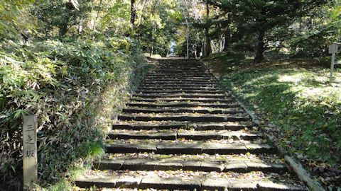 千杵坂、三之坂、一之坂などのいくつかの石段を登る。途中、竹林の中に墓碑が並んでいる。