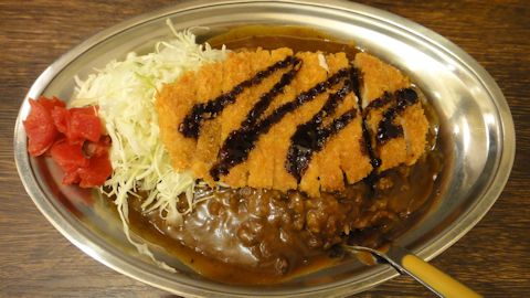 ゴールドカレーのカツカレー。やっぱり銀皿。 |