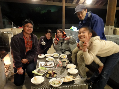 飯ごう2つで米を炊き、水炊き色々鍋を煮る。さらに管理棟から網を借りてきて、さんまを直火で焼く。そしてアルミホイルに包んだサツマイモを火に投入、焼き芋に仕立てる。