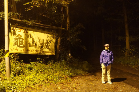 トンネルを抜け現実世界に戻ると、「ホテル亀山城」という巨大な看板が現れた。矢印で示された道は真っ暗。街灯の一つもない。ここは当然行くでしょう、ということで怖がるももちゃんを尻目に、僕と裕助が先陣を切って歩き始める。真っ暗。ライトがないと暗すぎてちょっと歩けない。落ち葉で敷き詰められた雑木林の坂道をしばらく上がると、高台の上に大きな建物があった。城のようには見えなかったが、これがホテル亀山城。あまりに暗い道を登ったので、もう営業を停止した廃ホテルなのかと思ったら、今でも普通に営業中のようである。懐中電灯を持った怪しい一団が来たからか、ロビーから従業員と思われるおばさんとおじさんがこちらを観察している。
