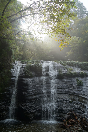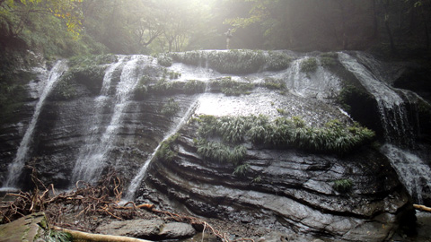 滝の下に降りる。滝の幅方向の中央部は、両側に比べてややなだらかな斜面となっており、ここを伝って降りられる。