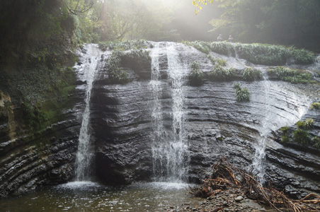 下から見上げると、その壁面がとてつもないことに気づく。黒光りする岩に、うねる地層が龍のように走っている。相川の梨沢大滝も、黒光りする壁面に地層がうねっていたが、この滝はスケールが違う。何しろ幅20m以上に渡って、地層がむき出しとなった壁に水が流れ落ちているのである。芸術的な滝。