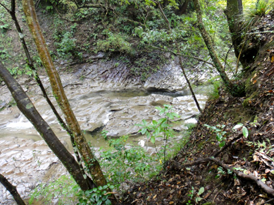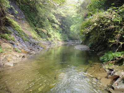 何とか降りようとするも結局断念し、また急斜面の薮をたどって淵の下流に降りる。