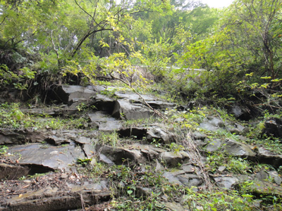 僕は諦めて、林道に上がることにした。さっきへつった場所はもうへつり戻れないので、途中の急斜面の崖を林道までよじ登る。10mくらいの急斜面、滑る。岩が出ているところをなんとか登り切る。決死の崖登り。
