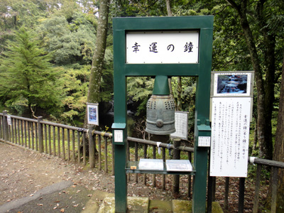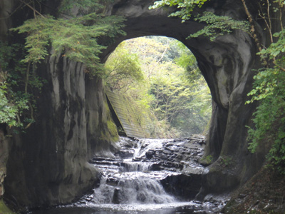 清水渓流広場という渋い公園に行く。笹川沿いの遊歩道に「幸運の鐘」という小さな鐘があり、みんなで「幸せになりますように」と鐘をつく。笹川に降りると、いきなり洞窟の中に滝が形成されて、白い水が落ちている。房総でよく見る川廻しのトンネルと滝だ。