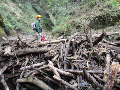 倒木がびっしり川の上を覆っているため、両岸の山に逃れずに、この倒木の上を行くことを決断する。倒木は一部なかば藪のようになっており、川の上を藪漕ぎするという異常事態となる。なんとか藪を漕ぎ、木の上を渡りしながら進む。木々の下には川が流れているのだが、木と水の間は中空になっているところがあり、そこを踏み外すと1mくらい下の川に転落する羽目になるので慎重に固定された木々を選びながら踏みつけていく。