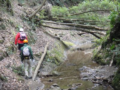 再び沢に降りて歩き始める。途中、たくさんの支沢が流れ込んでいる。倒木も多い。