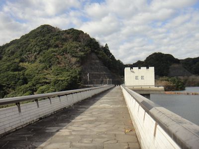 片倉ダムには8時半ごろに到着。ダムのコンクリート斜面を見ると、放水が斜面上を流れている。