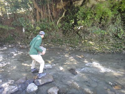 この川沿いを下流に歩き、割と広い石の河原に出る。ここで浅い川に河原の石を投げ込み、飛び石を作って川を渡る。飛び石が中途半端で、結局靴も靴下も濡れてしまう。今日は沢装備ではない。