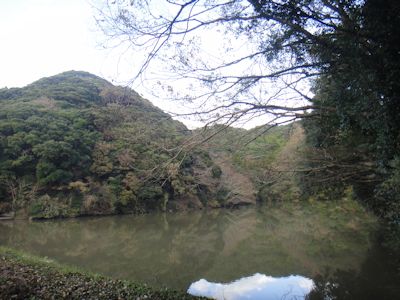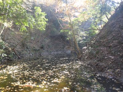 しばらく行くと、唐突に深い瀞場が現れる。深さは1mくらいあるだろう。今まで水がほとんど流れてなかった川に、水たまりのような深場が突然現れたのである。流れはない。しかも、長さ100m以上に渡って続いている。蛇行する川の先が見えないので、この瀞場の全長は分からないが、とても水に入っていくような陽気ではないし、両岸は斜面が急で、巻けそうにない。
