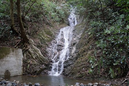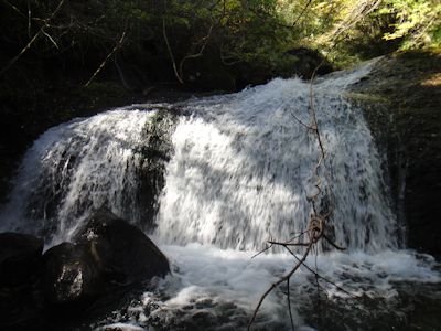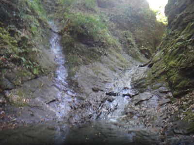 その後、もう一つ滝が出てくる。高さは2mほどだが、黒いいかつい岩肌が威圧してくる。滝の落口は両岸が狭まったU字型の川床となっている。落ちる水量は少ない。